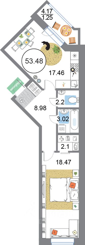 Продаётся 1 комнатная квартира в жилищном комплексе Modum (Корпус 3 секция 13). Общая площадь 53.48 кв. м, площадь комнат 18.47 кв.м. . Квартира расположена на 2 этаже 12 этажного дома. Сдается с отделкой White-box.