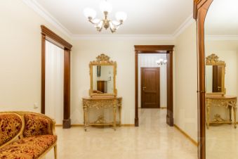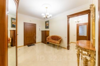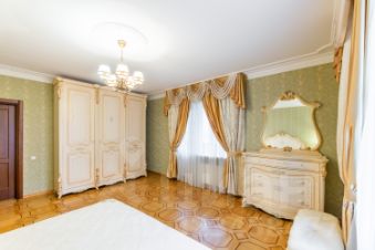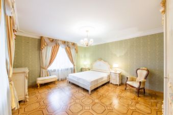 Интерьер в классическом стиле - отделочные материалы европейского производства, полы - наборный паркет, шумоизоляционная входная дверь, замки с перекодировкой, межкомнатные двери из массива дерева.