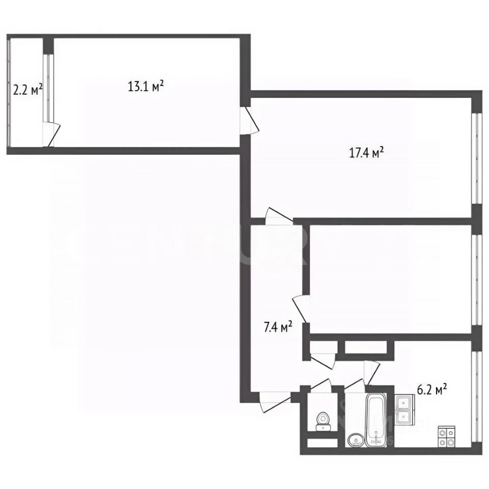 Смежно-раздельная планировка: две изолированные комнаты площадью 11,8 м² и 13,1 м² (с выходом на лоджию), одна проходная комната размером 17,4 м².