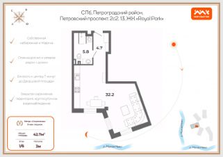 Арт. 124113186 Предлагаем к продаже апартаменты 43 м2 с прямым видом на Малую Неву В ЖК "Royal Park".