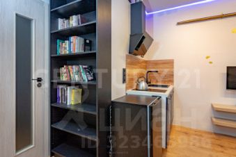 Студия полностью оборудована под сдачу либо самостоятельное проживание. Мебель (большой двуспальный диван, шкаф, стеллаж для хранения, пуф) и бытовая техника (телевизор, индукционная панель, холодильник, стиральная машина, вытяжка, чайник, утюг) остается.