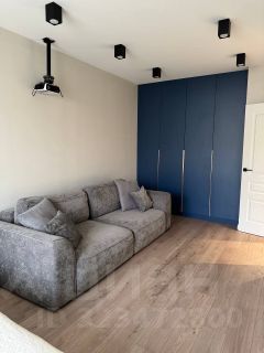 В комнате установлен встроенный шкаф на всю стену — максимум места для хранения без потери пространства.