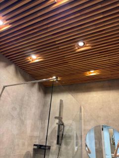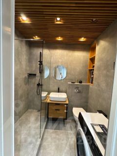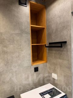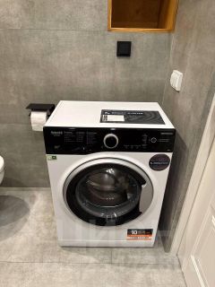 Слева — ванная комната с душевой кабиной, раковиной, туалетом с инсталляцией, стиральной машиной и удобными полками для полотенец и постельного белья.