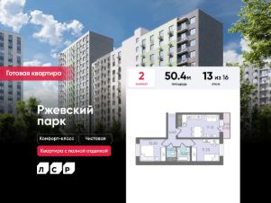 Продается 2-комнатная квартира в ЖК "ЛСР. Ржевский парк" на 13 этаже. Общая площадь составляет 50.40 кв. м. Квартира с чистовой отделкой. Жилой комплекс "ЛСР. Ржевский парк" располагается по адресу Ленинградская область, Всеволожский район, Ковалёво пос..