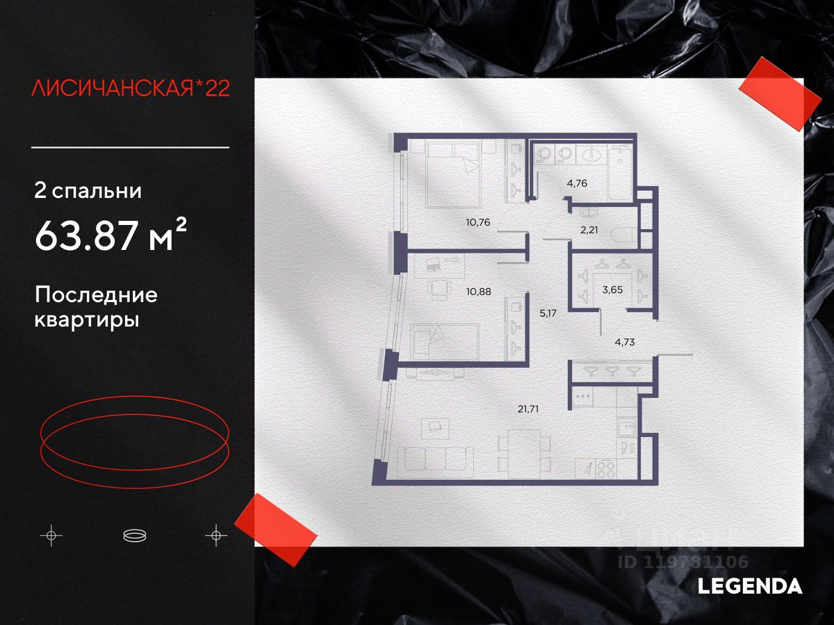 2-комн. квартира от застройщика с предчистовой отделкой в ЖК "Лисичанская, 22" на 10 этаже. Общая площадь: 63.87 кв.м., жилая: 21.64 кв.м., площадь просторной кухни-столовой: 21.71 кв.м. Комнаты изолированные, все окна выходят на одну сторону. В квартире один раздельный санузел. Высота потолков 2.7 м.