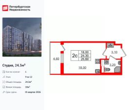 Удобная, классическая, функциональная европланировка, вместительная прихожая 3.1 м². Общая площадь студии - 24.3 м², жилая 18 м², высота потолка 2.77 м.