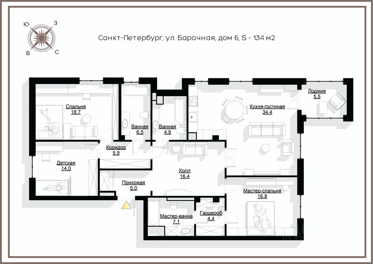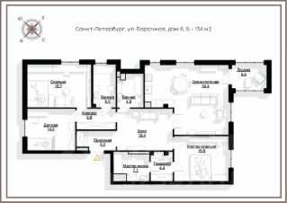 Планировка идеально подходит для семьи с двумя или тремя детьми: просторная мастер-спальня со своим гардеробом и санузлом, две детские спальни, уютная кухня-гостиная, комната отдыха, гостевой санузел и редкая деталь — детский санузел с окном. Высота потолков — 3 метра, окна выходят на три стороны света. Из гостиной и мастер-спальни открывается вид на отреставрированный хлебозавод 1930-х годов в стиле конструктивизма, а из детских — на зелёные фасады и исторические улицы Петроградки.