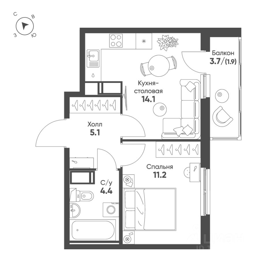 Продается квартира 108, по адресу г. Санкт-Петербург, поселок Шушары, Школьная улица, корпус Клюква.Парк, 3 очередь в Клюква.Парк на 11 этаже, с площадью 36.7 м2.
