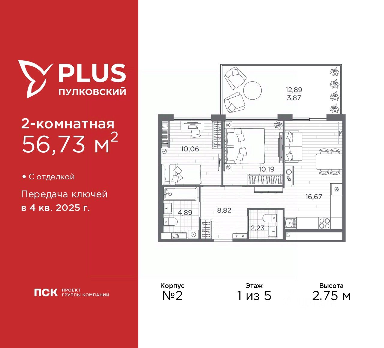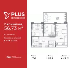 Просторная двухкомнатная квартира с отделкой в ЖК "PLUS Пулковский" на 1 этаже. Общая площадь: 56.73 кв.м., жилая: 20.25 кв.м., площадь просторной кухни-столовой: 16.67 кв.м. Комнаты изолированные, все окна выходят на одну сторону. В квартире один балкон, один совмещенный и один раздельный санузел. Терраса представляет собой роскошную зону отдыха, где вы на свой вкус можете создать атмосферу комфорта и уюта. Высота потолков 2.75 м.