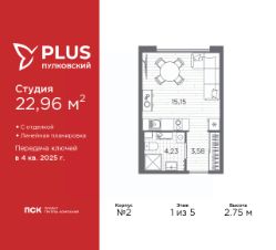1-комн. квартира-студия с отделкой в ЖК "PLUS Пулковский" на 1 этаже. Общая площадь: 22.96 кв.м., площадь гостиной 15.15 кв.м., из которых 5 кв.м. выделено под кухонную зону. Все окна выходят на одну сторону. В квартире один совмещенный санузел. Высота потолков 2.75 м.