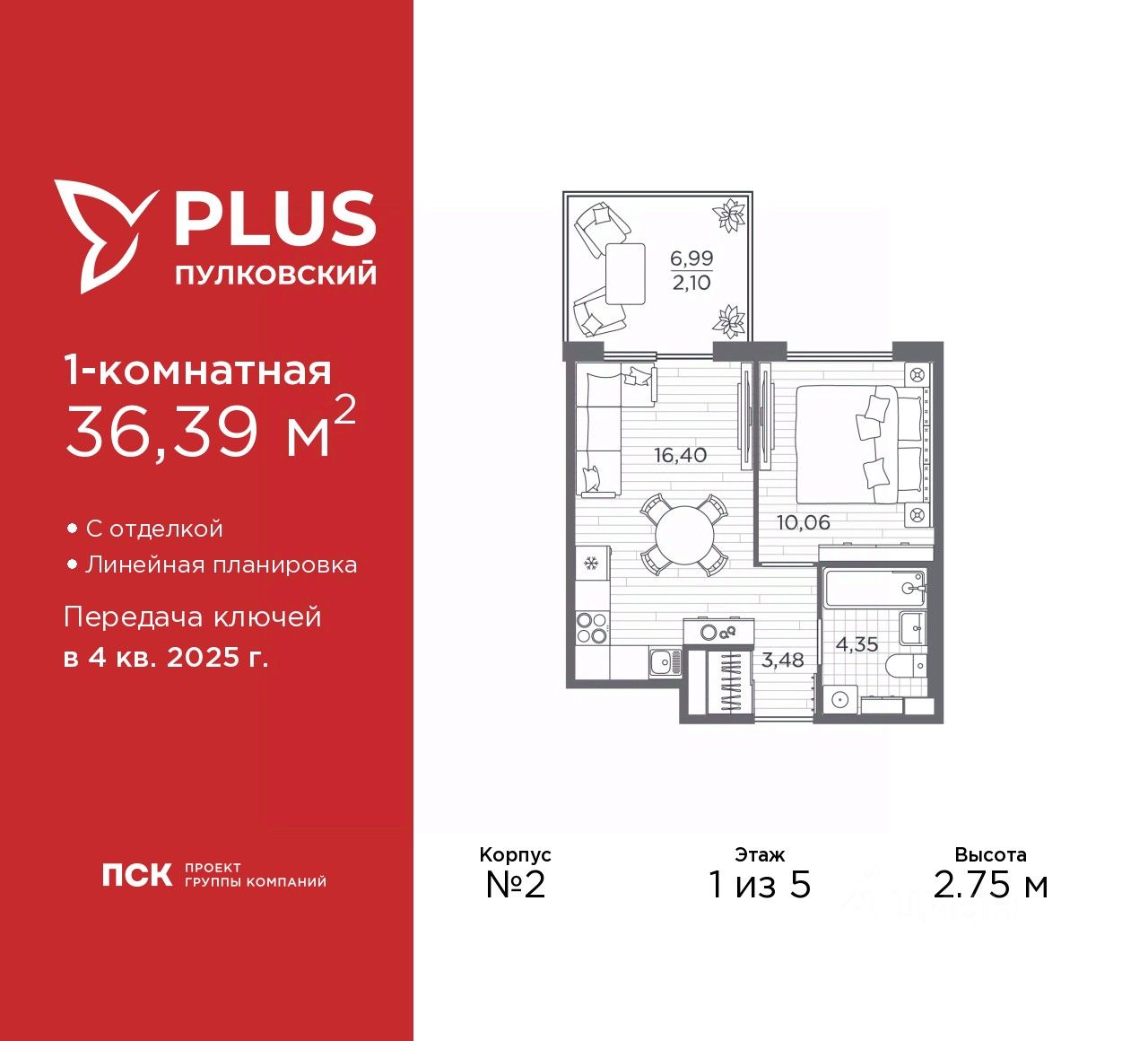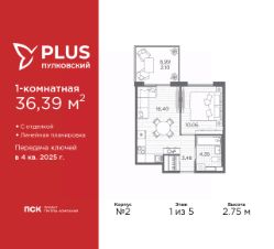 Однокомнатная квартира с отделкой в ЖК "PLUS Пулковский" на 1 этаже. Общая площадь: 36.39 кв.м., жилая: 10.06 кв.м., площадь просторной кухни-столовой: 16.4 кв.м. Все окна выходят на одну сторону. В квартире один балкон, один совмещенный санузел. Наличие террасы в квартире открывает возможность для создания зон отдыха в кругу семьи и друзей. Высота потолков 2.75 м.