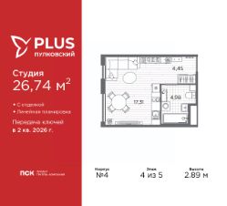 Однокомнатная квартира-студия с отделкой в ЖК "PLUS Пулковский" на 4 этаже. Общая площадь: 26.74 кв.м., площадь гостиной 17.31 кв.м., из которых 5 кв.м. выделено под кухонную зону. Все окна выходят на одну сторону. В квартире один совмещенный санузел. Высота потолков 2.89 м.