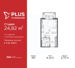 Продается однокомнатная квартира-студия с отделкой в ЖК "PLUS Пулковский" на 4 этаже. Общая площадь: 24.82 кв.м., площадь гостиной 16.37 кв.м., из которых 5 кв.м. выделено под кухонную зону. Все окна выходят на одну сторону. В квартире один балкон, один совмещенный санузел. Высота потолков 2.75 м.