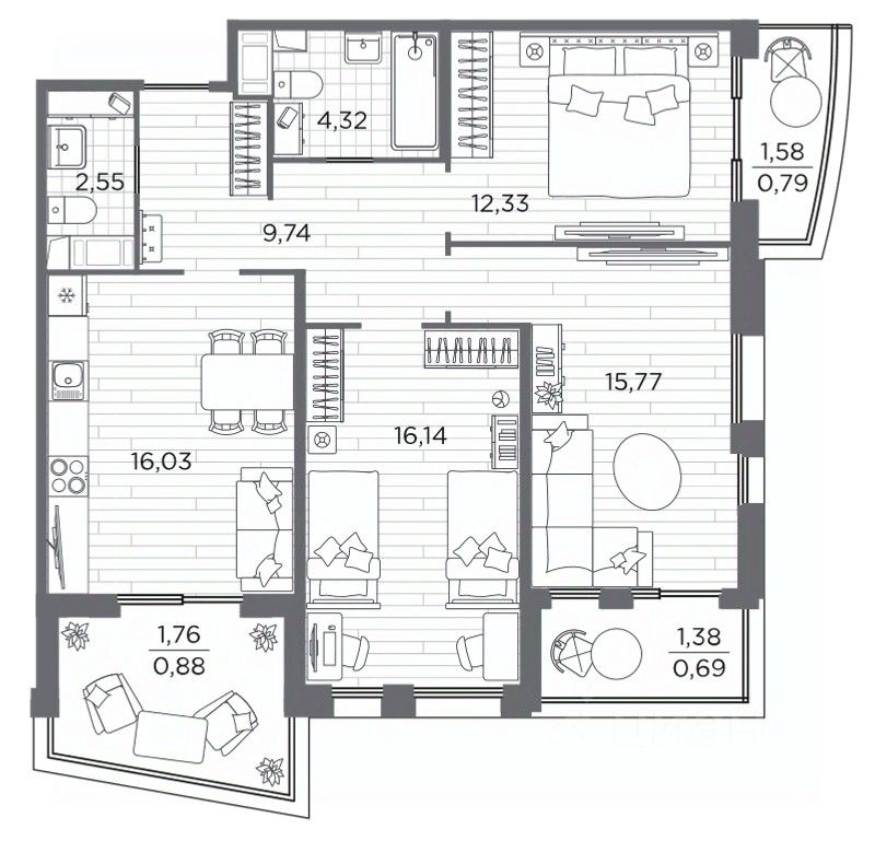 Трехкомнатная квартира с отделкой в ЖК "RESPECT" на 13 этаже. Общая площадь: 79.84 кв.м., жилая: 44.24 кв.м., площадь просторной кухни-столовой: 16.03 кв.м. Угловая квартира, идеально подойдет любителям тишины и панорамных видов. В квартире один балкон и две лоджии, один совмещенный и один раздельный санузел. Высота потолков 2.7 м.
