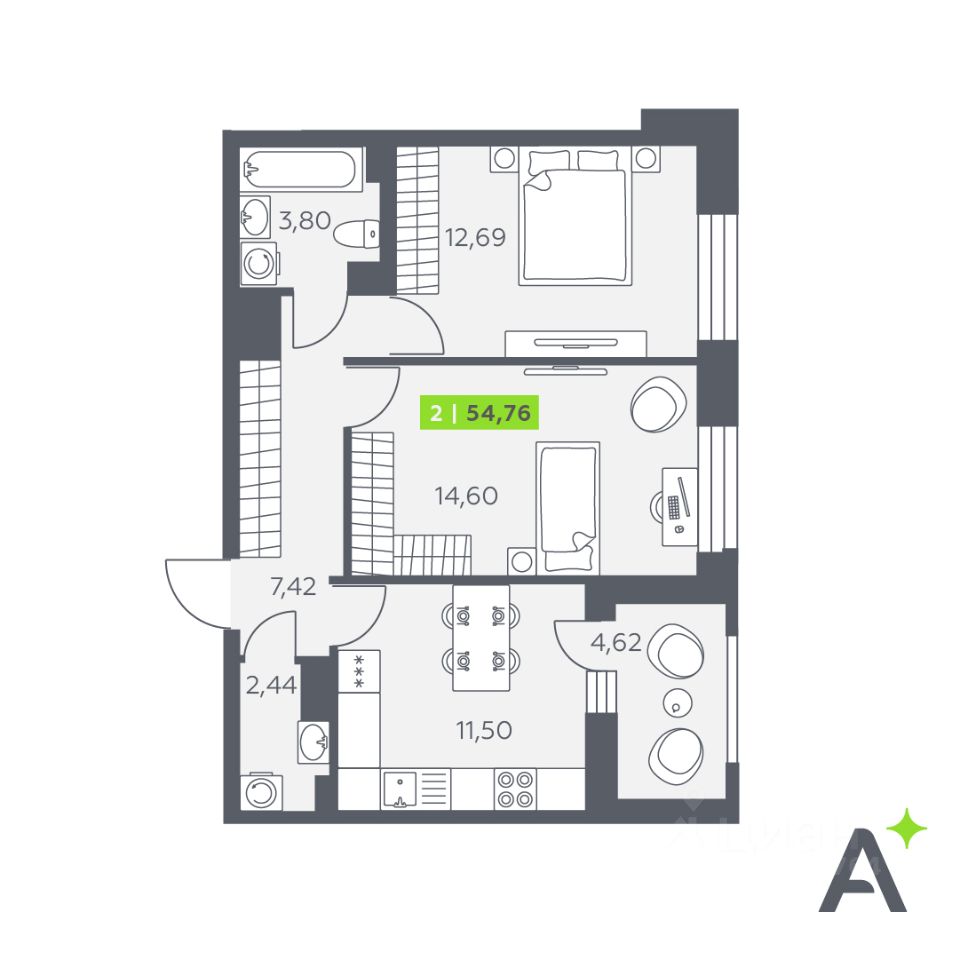 Общая площадь54,76 м²