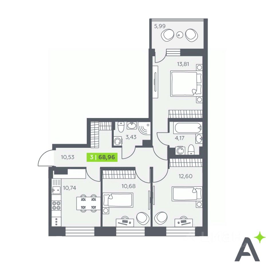68,96 м²