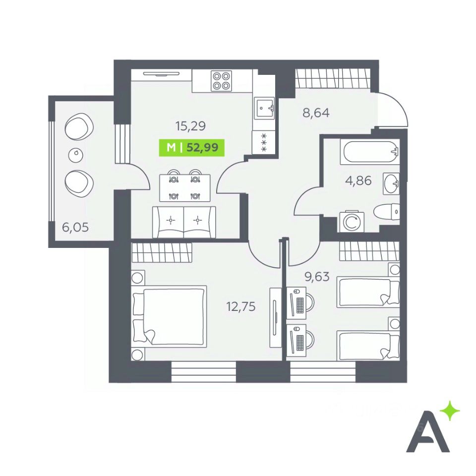 Общая площадь52,99 м²