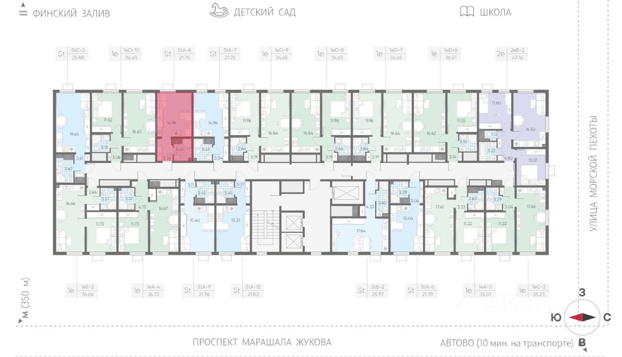 Продается студия в ЖК "Морская миля" на 16 этаже. Общая площадь составляет 21.75 кв. м. Квартира с чистовой отделкой. Жилой комплекс "Морская миля" располагается по адресу Санкт-Петербург, Красносельский.