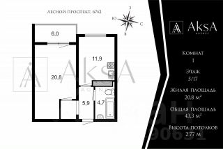 + Классическая планировка: изолированная комната 20,8м2 с выходом на лоджию 6м2, кухня 11,9м2, коридор 5,9м2 с встроенным шкафом, совмещенный санузел 4,7м2