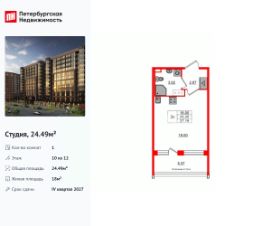 Удобная, классическая, функциональная европланировка, вместительная прихожая 2.87 м². Общая площадь студии - 24.49 м², жилая 18 м², высота потолка 2.75 м.