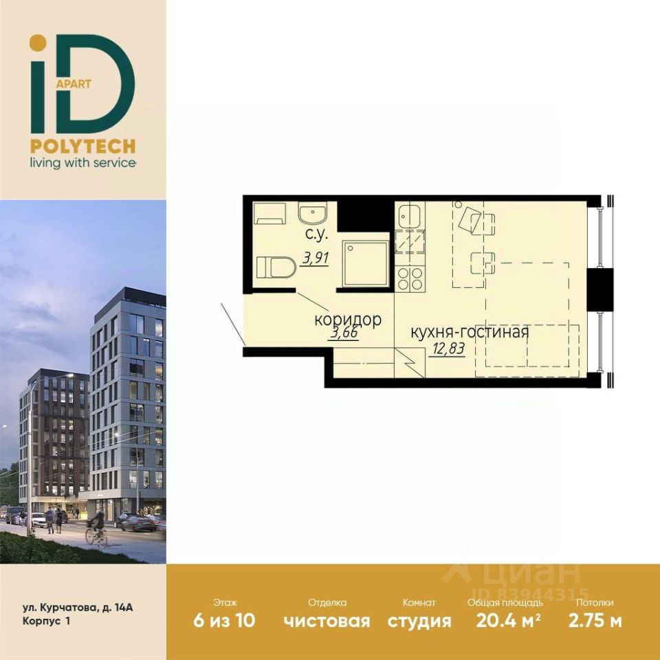 В продаже стильная эргономичная студия с готовой отделкой в эксклюзивном апарт-комплексе iD Polytech.