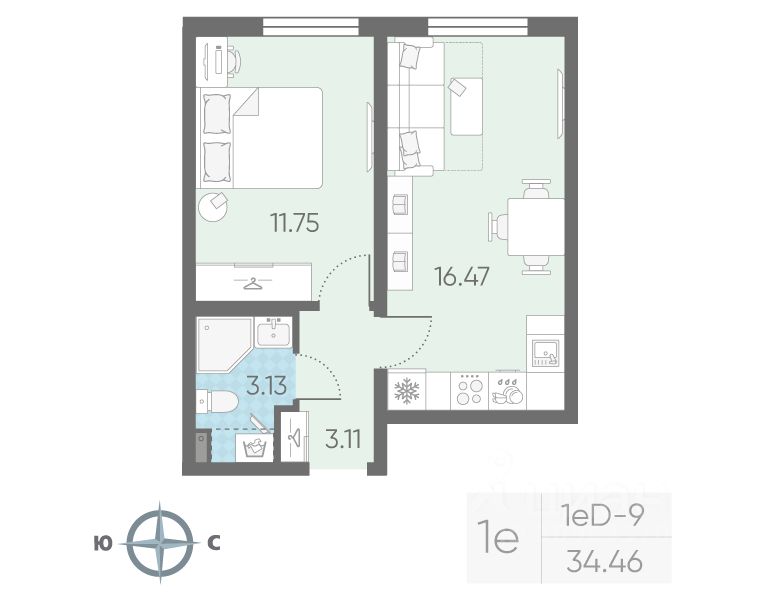 Продается 1-комнатная квартира в ЖК "Морская миля" на 2 этаже. Общая площадь составляет 34.46 кв. м. Квартира с чистовой отделкой. Жилой комплекс "Морская миля" располагается по адресу Санкт-Петербург, Красносельский.