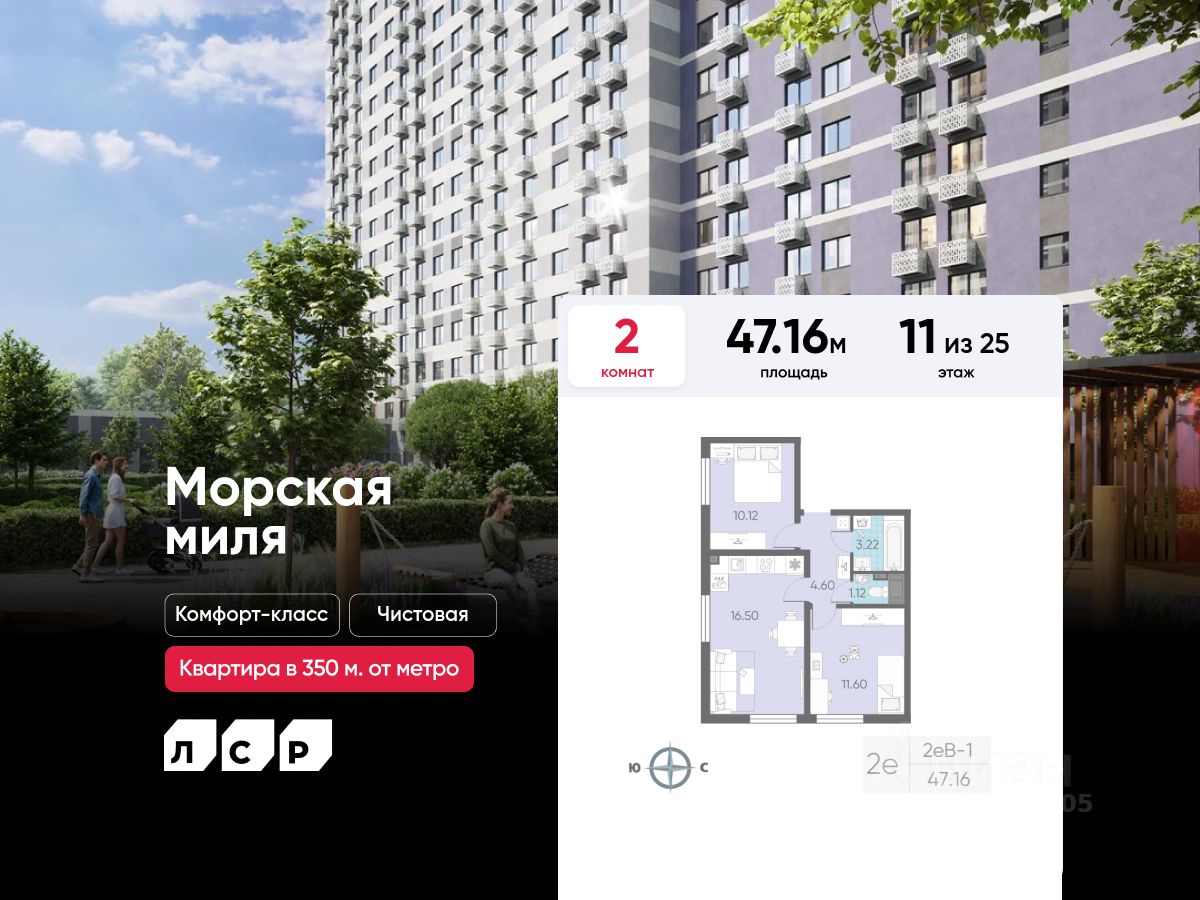 Продается 2-комнатная квартира в ЖК "Морская миля" на 11 этаже. Общая площадь составляет 47.16 кв. м. Квартира с чистовой отделкой. Жилой комплекс "Морская миля" располагается по адресу Санкт-Петербург, Красносельский.
