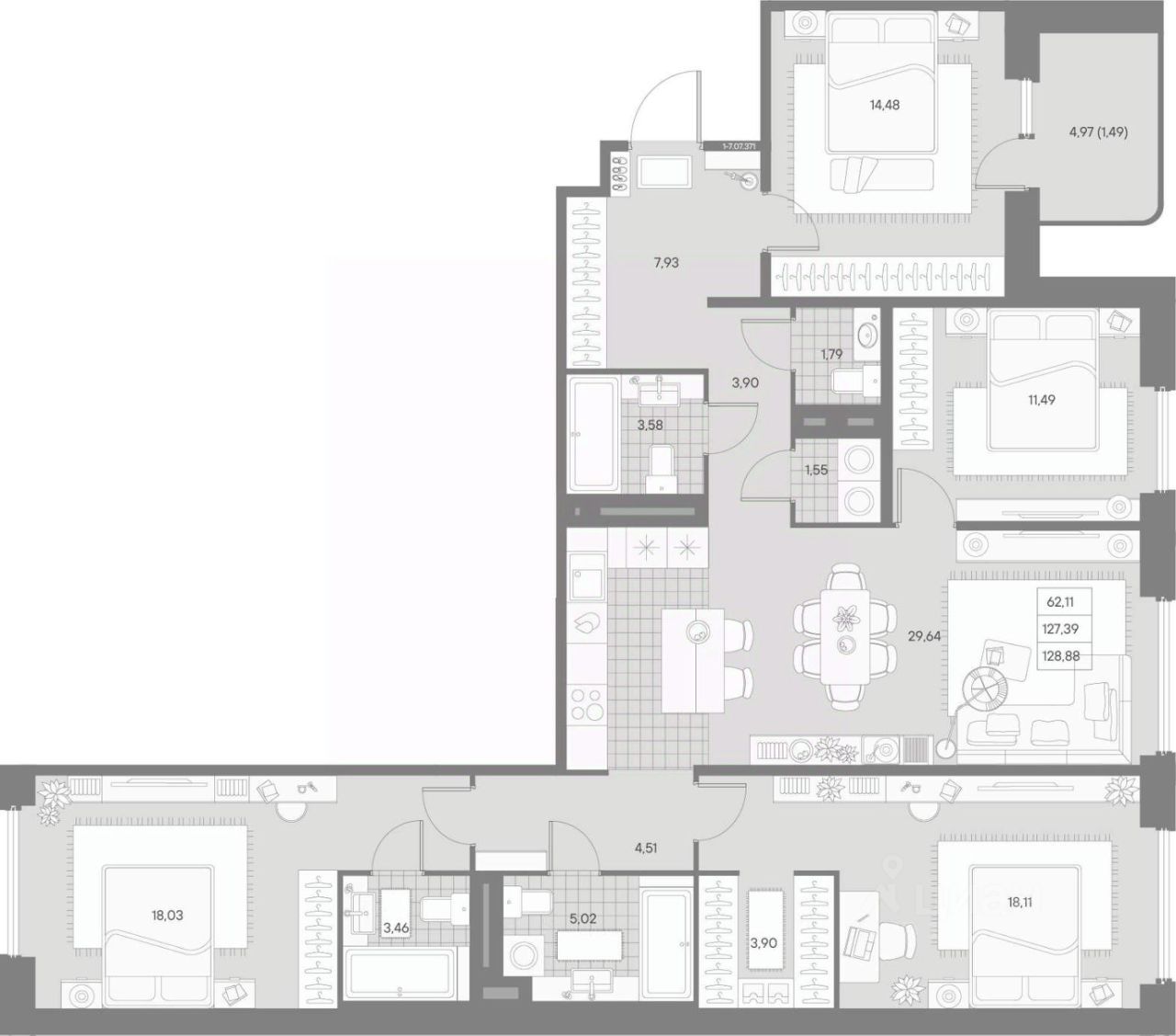 В историческом центре с особой атмосферой Петроградской стороны представлена 4-х комнатная квартира на 7 этаже общей площадью 128.88 кв.м.