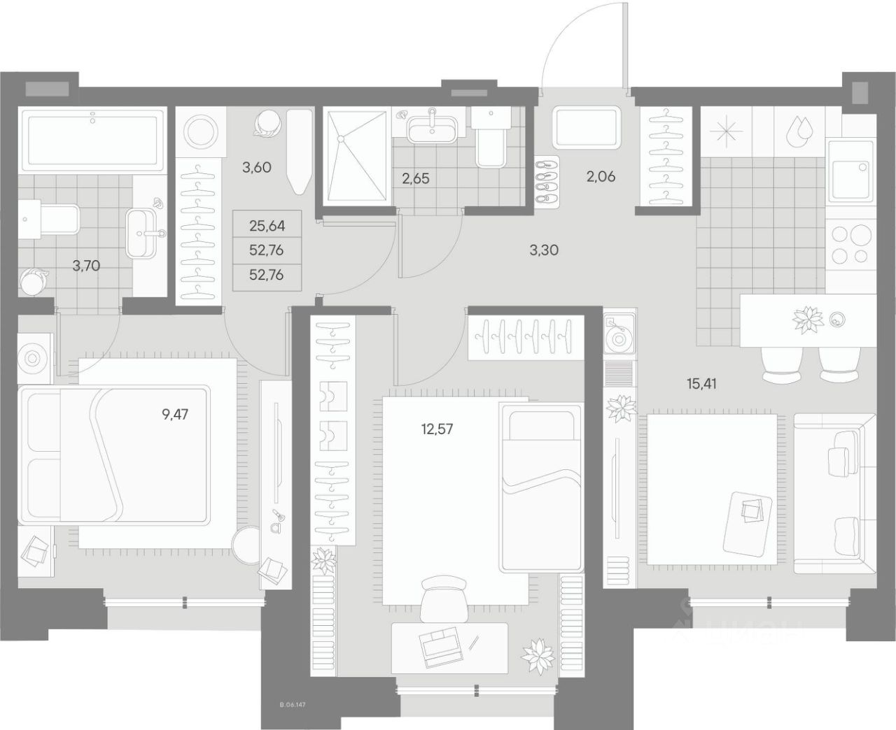 В центре Петербурга на берегу реки Охты представлена 2-х комнатная квартира на 6 этаже общей площадью 52.76 кв.м.