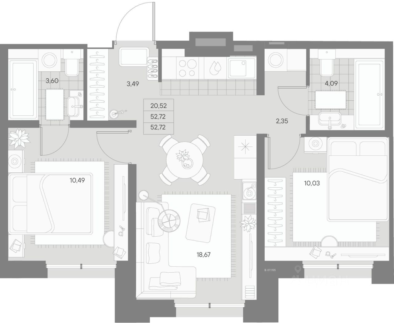 В центре Петербурга на берегу реки Охты представлена 2-х комнатная квартира на 7 этаже общей площадью 52.72 кв.м.