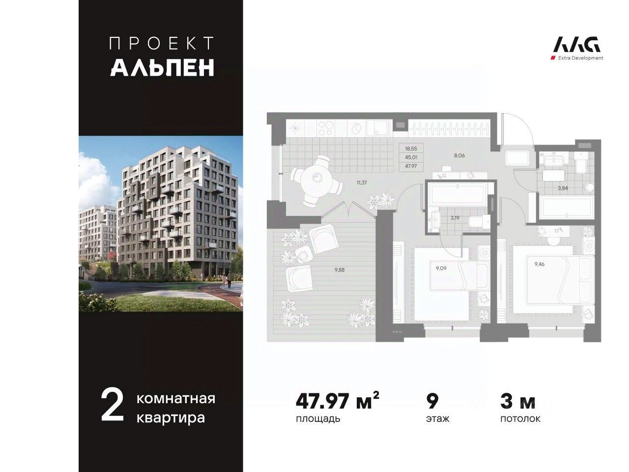 В центре Петербурга на берегу реки Охты представлена 2-х комнатная квартира на 9 этаже общей площадью 47.97 кв.м.