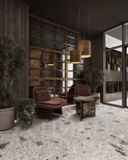 В корпусе расположена зеленая гостиная - полуприватная зона на 2-4 человека с деревянными креслами и диваном, а также детская площадка, интегрированная в сосны.
