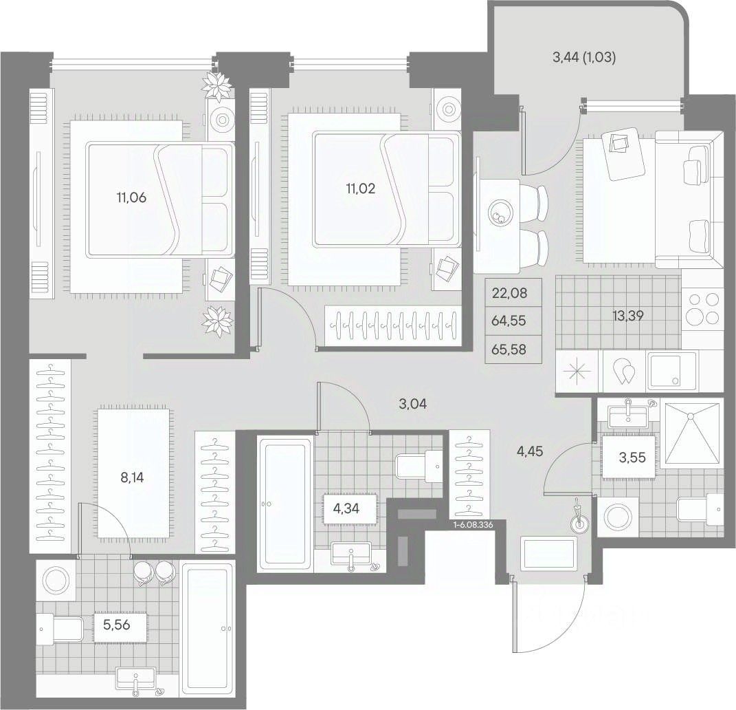Жилая площадь 22.08 м2, кухня 13.39 м2, черновая отделка.