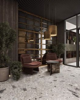 В корпусе расположена зеленая гостиная - полуприватная зона на 2-4 человека с деревянными креслами и диваном, а также детская площадка, интегрированная в сосны.