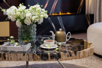 Просторная прихожая, гостевой санузел, изолированная гостиная с камином и зоной отдыха. Функциональная кухня оснащена техникой встроенного типа от Gaggenau и Miele, включая вакууматор и винный холодильник. Гарнитур и столовая группа — итальянские бренды Rossana и Casa Milano.