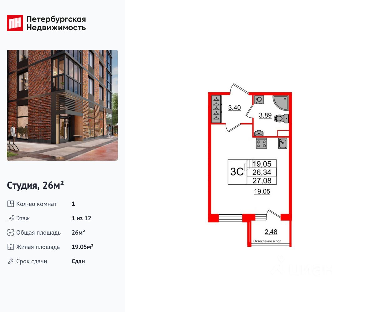 Удобная, классическая, функциональная европланировка, просторная прихожая 3.4 м². Общая площадь студии - 26 м², жилая 19.05 м², высота потолка 2.77 м.