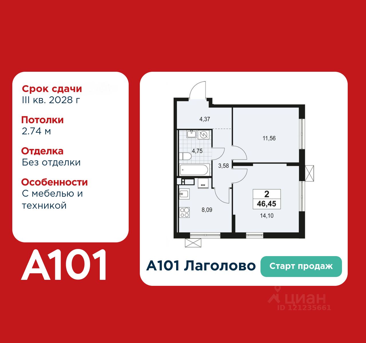 Старт продаж! 2-комнатная квартира площадью 46.45 в ЖК "А101 Лаголово" на 4 этаже. Квартира без отделки. Вид из окна на улицу. В квартире 1 санузел. Высота потолков 2.74 м.