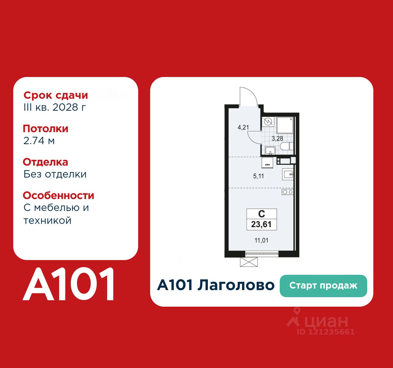 Старт продаж! Студия площадью 23.61 в ЖК "А101 Лаголово" на 4 этаже. Квартира без отделки. Вид из окна на улицу. В квартире 1 санузел. Высота потолков 2.74 м.