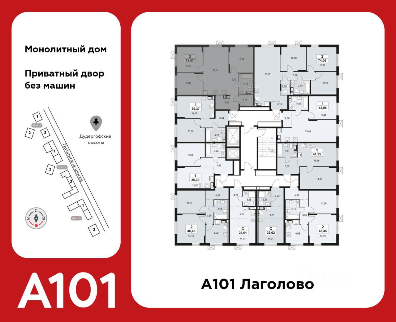 3-комнатная квартира площадью 71.07 в ЖК "А101 Лаголово" на 3 этаже. Квартира без отделки. Вид из окна на улицу. В квартире 2 санузла. Высота потолков 2.84 м. Особенность планировки - гардеробная.