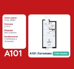Старт продаж! Студия площадью 23.61 в ЖК "А101 Лаголово" на 3 этаже. Квартира без отделки. Вид из окна на улицу. В квартире 1 санузел. Высота потолков 2.74 м.