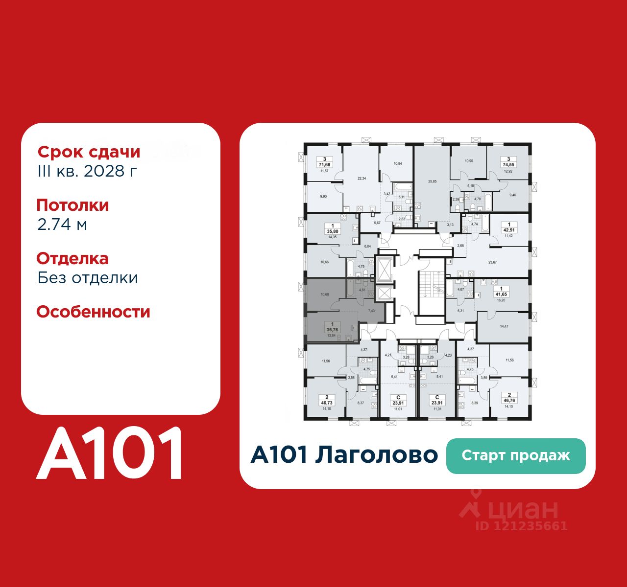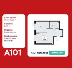 Старт продаж! 1-комнатная квартира площадью 36.76 в ЖК "А101 Лаголово" на 2 этаже. Квартира без отделки. Вид из окна на улицу. В квартире 1 санузел. Высота потолков 2.74 м.