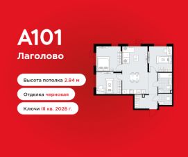3-комнатная квартира площадью 71.68 в ЖК "А101 Лаголово" на 2 этаже. Квартира без отделки. Вид из окна на улицу. В квартире 2 санузла. Высота потолков 2.84 м.