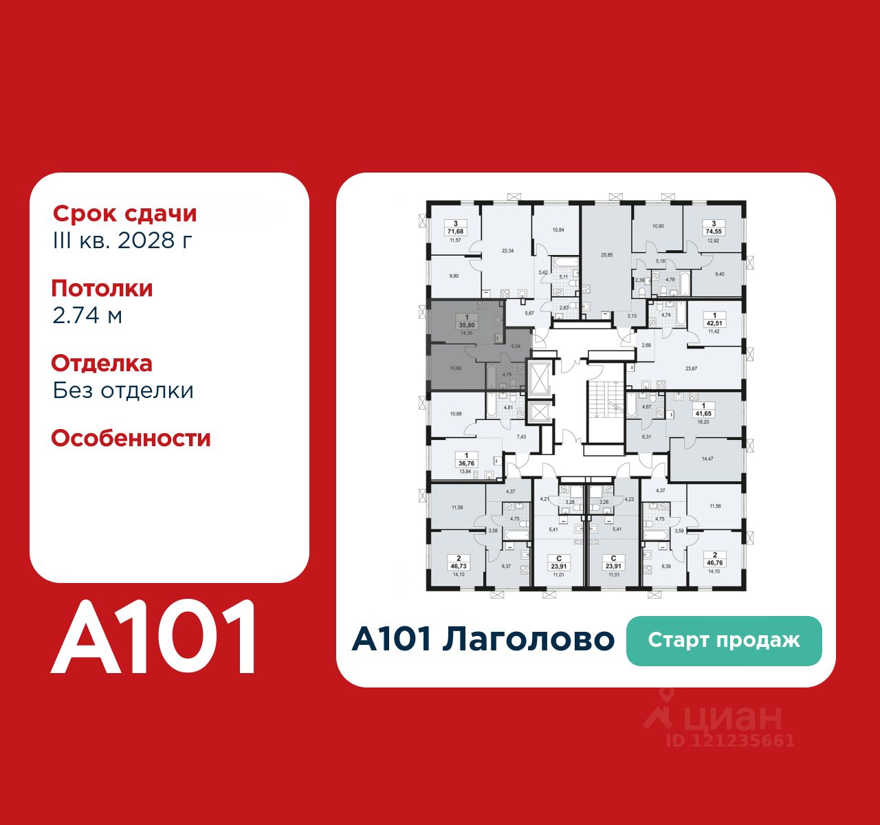 Старт продаж! 1-комнатная квартира площадью 35.80 в ЖК "А101 Лаголово" на 2 этаже. Квартира без отделки. Вид из окна на улицу. В квартире 1 санузел. Высота потолков 2.74 м.