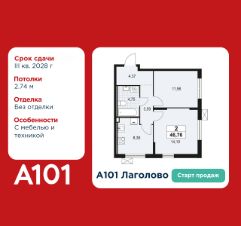 Старт продаж! 2-комнатная квартира площадью 46.76 в ЖК "А101 Лаголово" на 2 этаже. Квартира без отделки. Вид из окна на улицу. В квартире 1 санузел. Высота потолков 2.74 м.