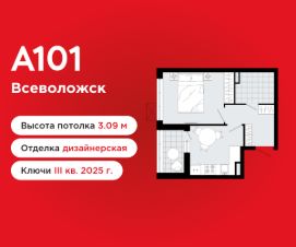 1-комнатная квартира площадью 32.50 с чистовой отделкой и мебелью в ЖК "А101 Всеволожск" c лоджией на 12 этаже. Вид из окна на улицу. В квартире 1 санузел. Высота потолков 3.09 м.