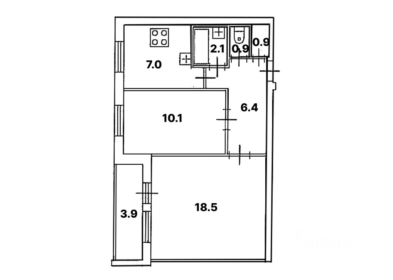 Уютная кухня-столовая 7 кв.м. с зонированием на обеденную зону и зону приготовления пищи. Две жилые комнаты: 10.1 кв.м. и 18.5 кв.м. с выходом на остекленную лоджию 3,9 кв.м., которая может служить дополнительным пространством для отдыха, хобби или хранения вещей. Кладовая 0.9 кв.м. оборудованная полками для хранения. Прихожая 6.4 кв.м. с местом под шкаф. Санузел раздельный.