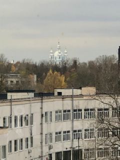 Из окон квартиры виден Смольный собор — символ Петербурга, создающий ощущение уюта и связи с историей города.