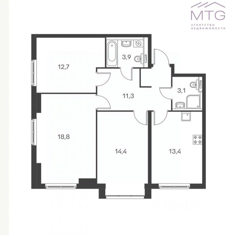 18.8 м2, 14.4м2 и 12.7 м2 окна выходят во двор.