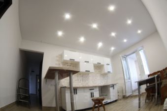 Натяжные потолоки со светодиодными светильниками по всей квартире.