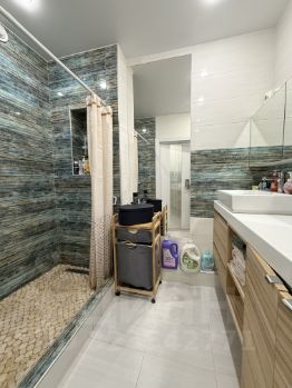 На полу высокопрочный, водостойкий ламинат (14 мм), ванная комната и отдельный санузел с гигиеническим душем, проточный водонагреватель (на период отключения горячей воды).